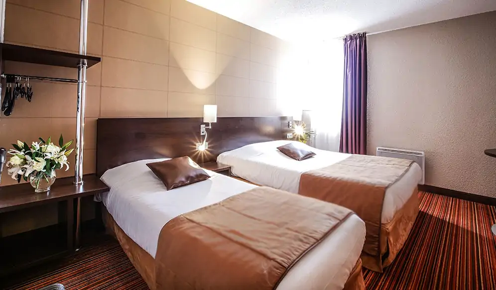 Une chambre confortable comprenant deux lits individuels, un coin bureau et une salle d’eau privative.